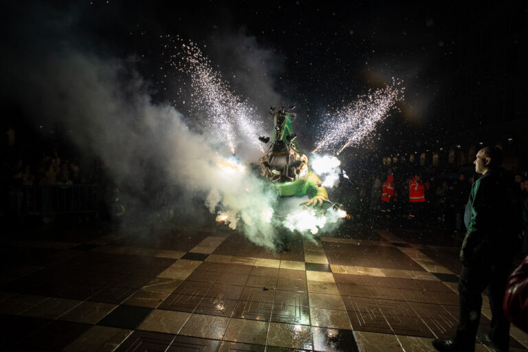 El encendido del ‘fogueró’ de la plaza Major por el Drac de na Coca dio paso al inicio de la fiesta de la víspera del patrón de la ciudad.