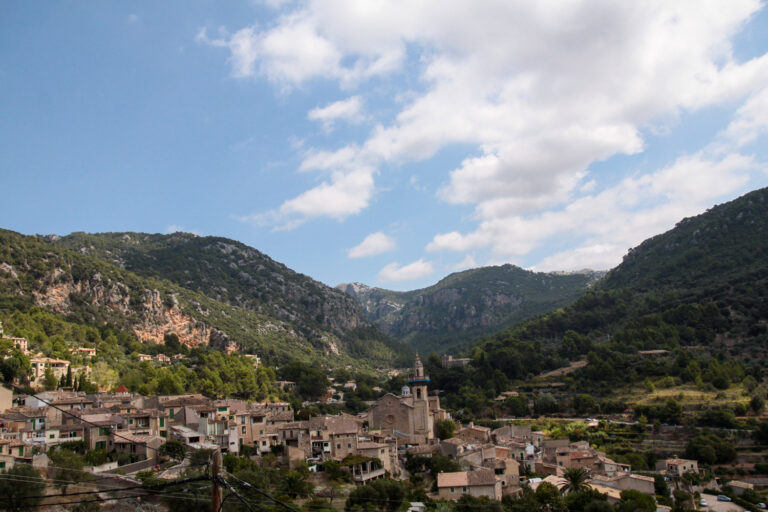 - Marratxí y Bunyola: El corazón verde de la isla salpicado de blanco, con montañas al fondo.